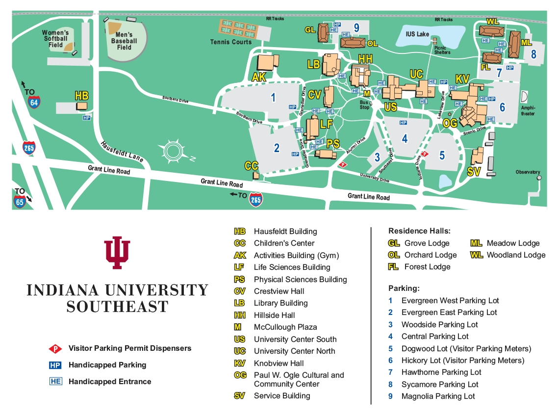 Cross the Lincoln Bridge and drive north to Exit 6B to I-265 West. Follow I-265 to the second exit (Exit 3), which is Grant Line Road. Turn right (north); drive one quarter mile to the IU Southeast main entrance.